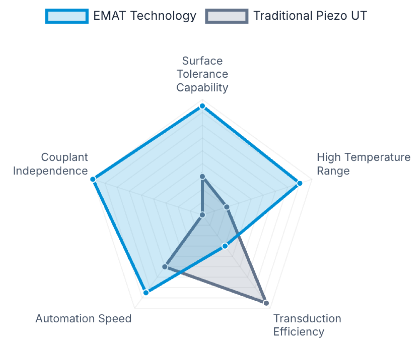 There is no single best ultrasonic thickness gauge. There is only the right one for the conditions in front of you. The chart below captures the broad performance profile of each technology. EMAT pulls ahead on surface tolerance, couplant independence, high-temperature range, and automation speed. Piezo leads on transduction efficiency and material versatility. Neither wins everywhere.