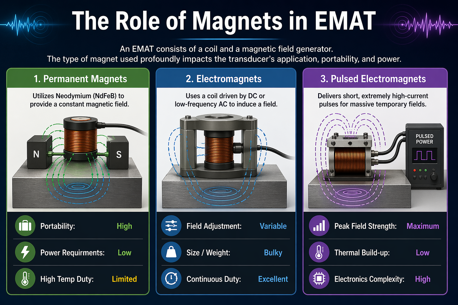 An EMAT consists of a coil and a magnetic field generator. The type of magnet used profoundly impacts the transducer’s application, portability, and power.