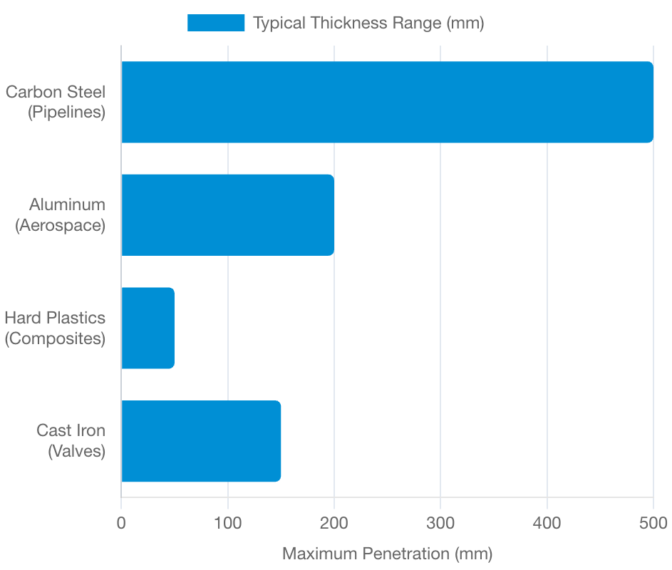 These ranges assume standard contact transducers with appropriate frequency selection. Higher frequencies resolve thinner walls; lower frequencies push deeper into attenuative materials like cast iron.