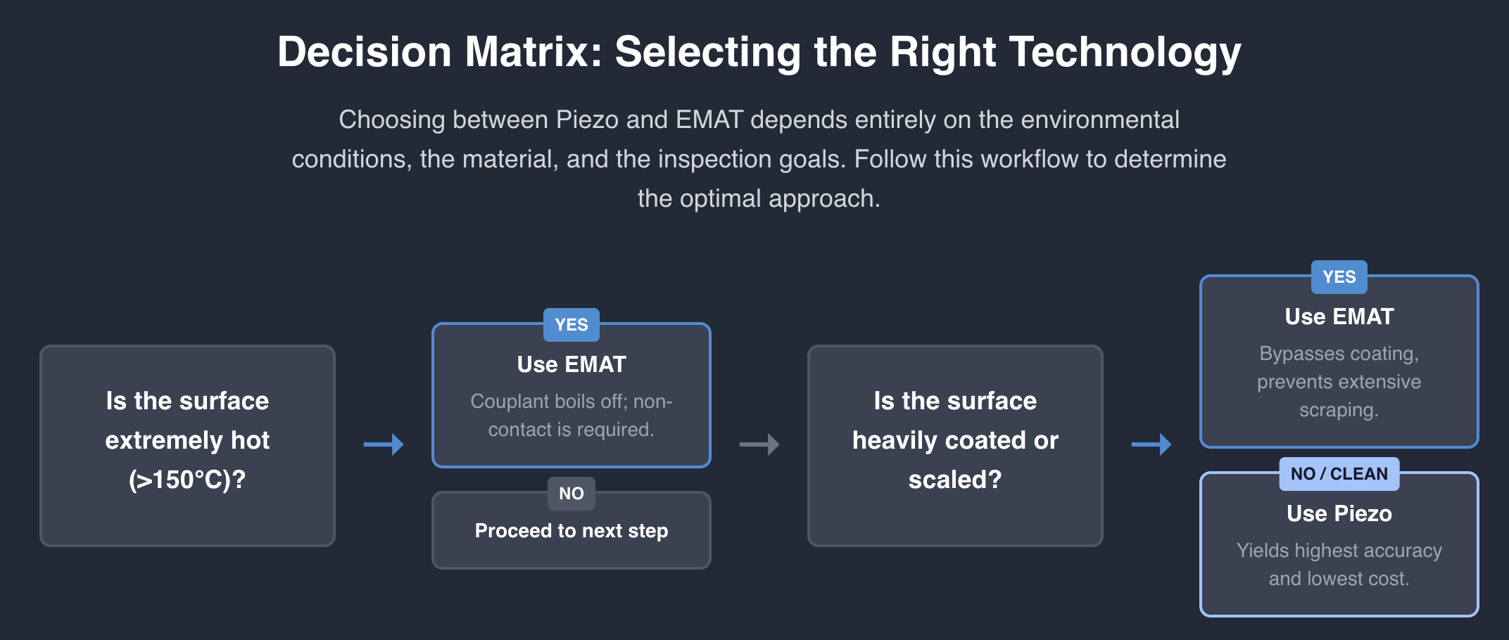The answers to these questions tend to sort themselves naturally. Piezo for the standard conditions. EMAT for the tough ones. Both in the toolkit for full coverage.