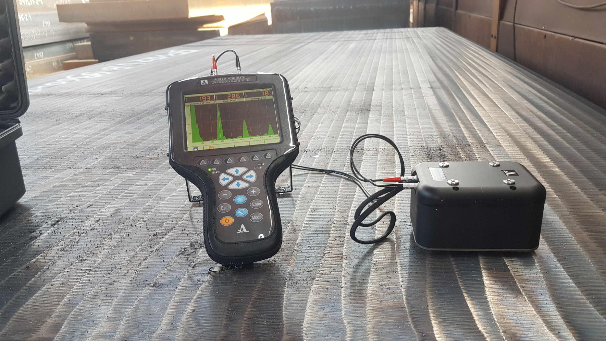 The speed of sound varies by material. In carbon steel it runs around 5,920 m/s. In aluminum, roughly 6,320 m/s. The gauge needs to know this value for the material being tested, which is why calibration on a known reference block is standard practice before every job.