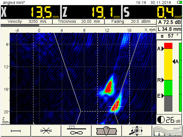 The instrument has ultra-compact design and is performed in lite-weight shockproof plastic housing. 800-gram weight allows one hand operation in hardly accessible locations. The Multi-SAFT image reconstruction technology offers unique flaw detection capability and extraordinary spatial resolution. Additional imaging and analysis functionality is provided by included INTROVIEW visualization software.