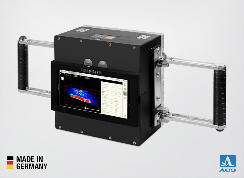 A1040 MIRA 3D Pro is a low-frequency ultrasonic tomography system suitable for manual and automated assessment of concrete structures.