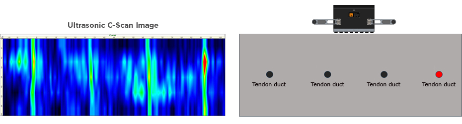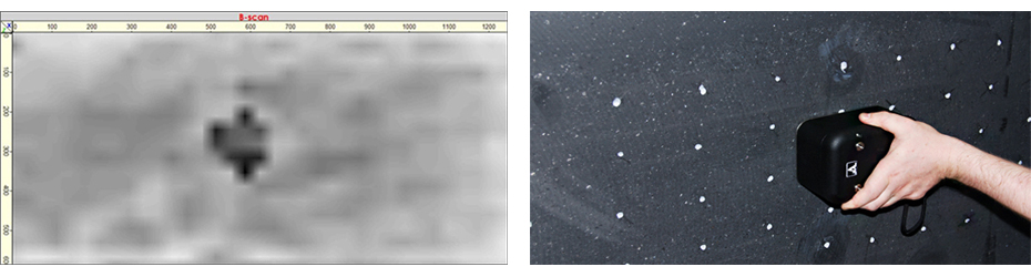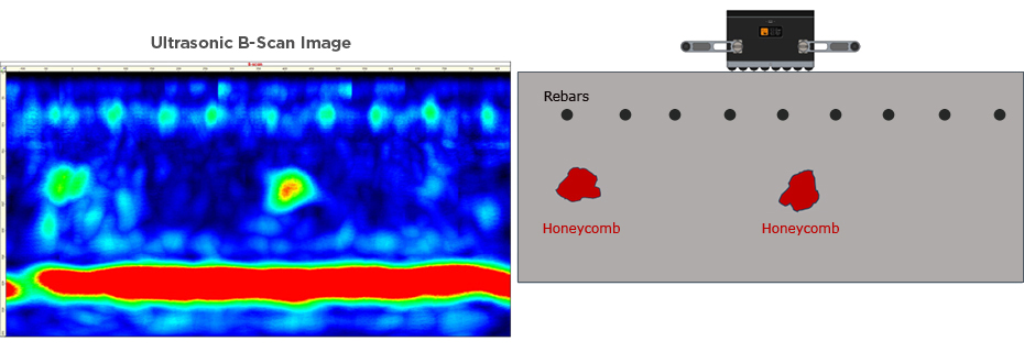 The ultrasonic pulse-echo tomography is the most suitable technology for detecting voids, honeycombs, and delaminations even below the several rebar grid. While a dense rebar structure will shield a GPR signal from penetrating deeper into the structure, an ultrasonic pulse-echo signal passes through is able to detect deeper-lying voids.