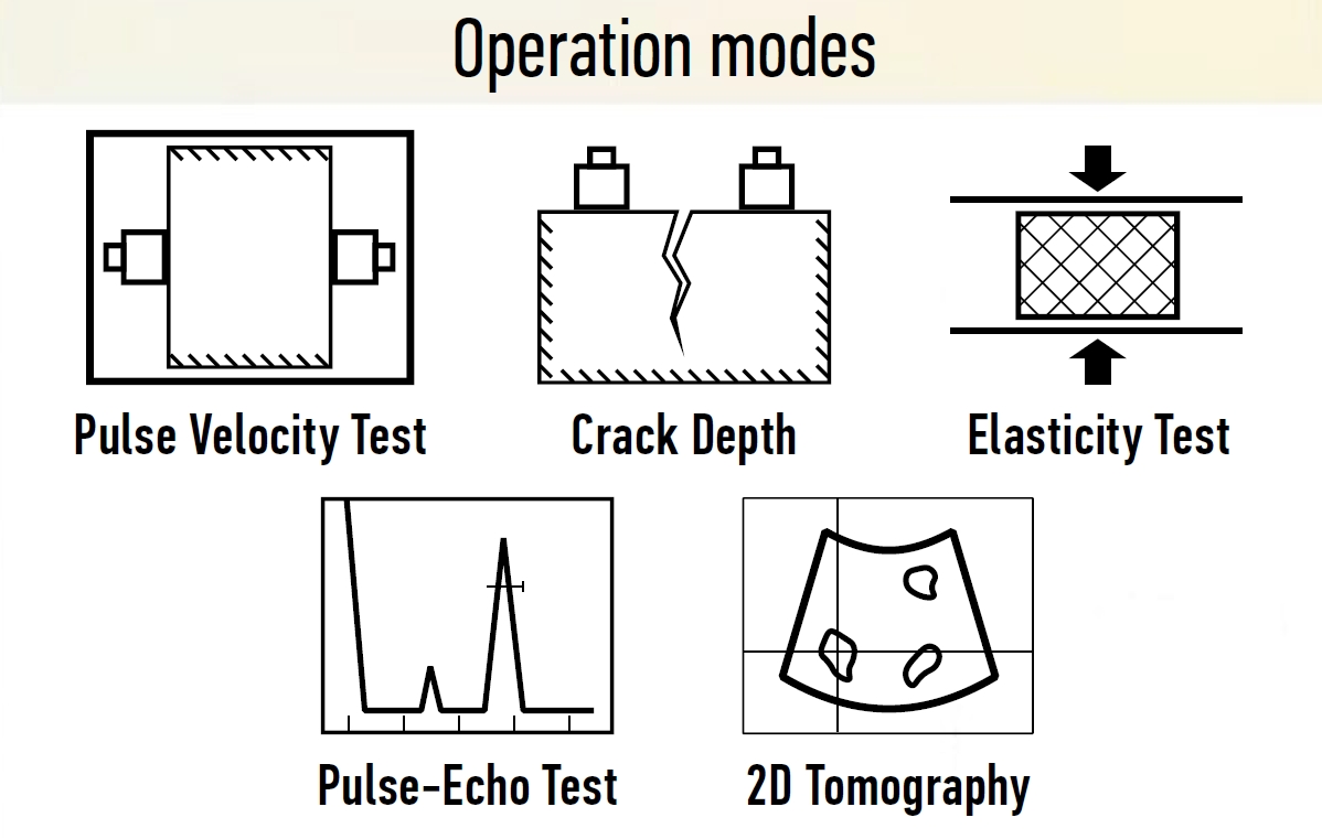 The instrument is suitable for compressive strength evaluation of concrete, estimation of the open crack depth, evaluation of elastic properties as well as pulse-echo testing including 3-dimensional imaging based on SAFT principle.