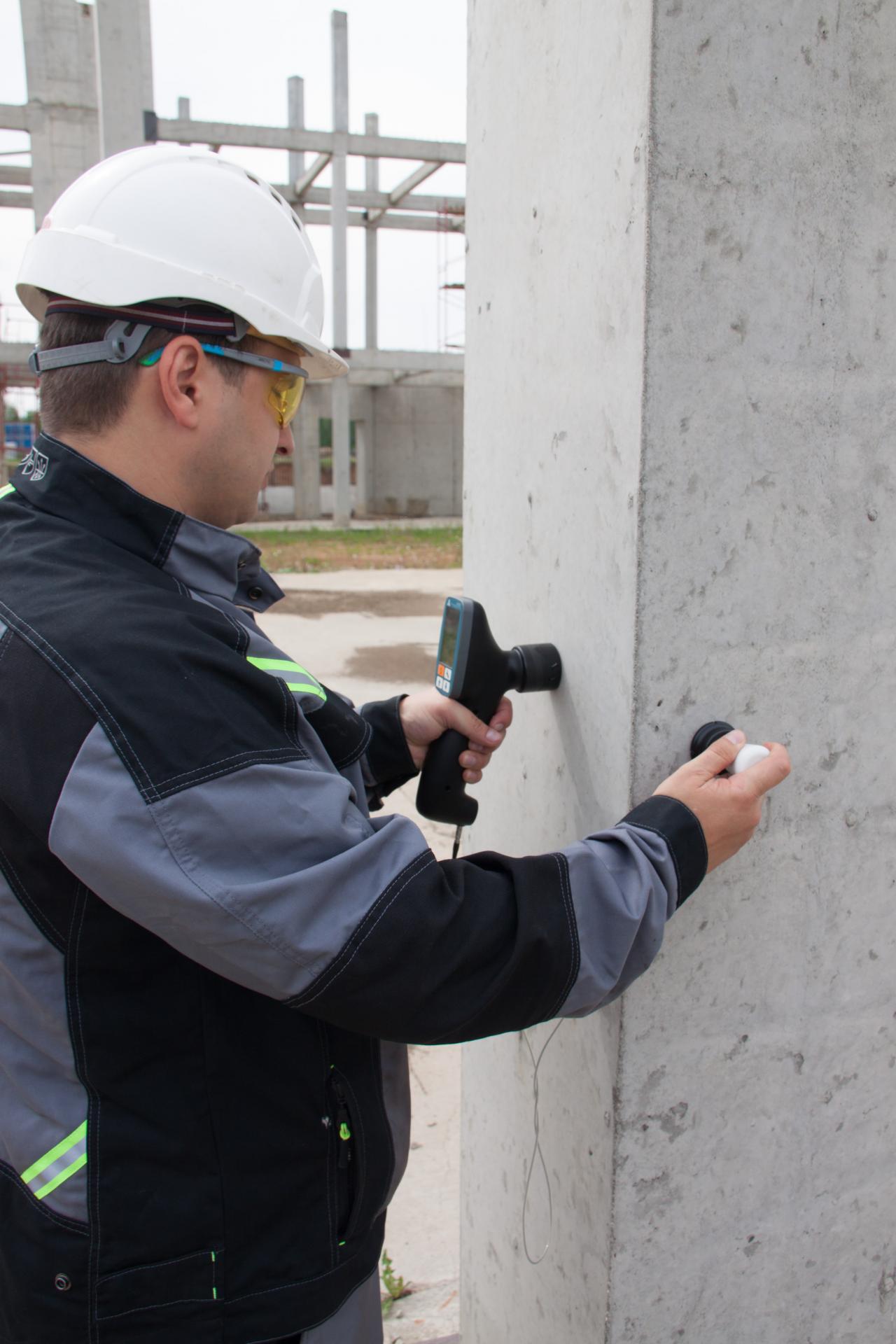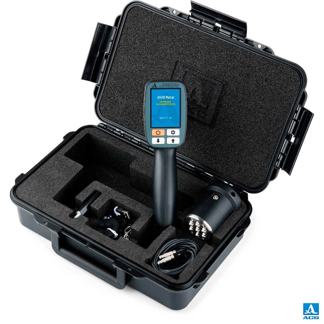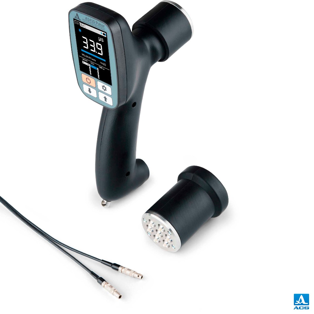 The world-first ultrasonic pulse velocity testing instrument for couplant-free on-site quality assessment of concrete structures with up to 2 meters thru-transmission capability.