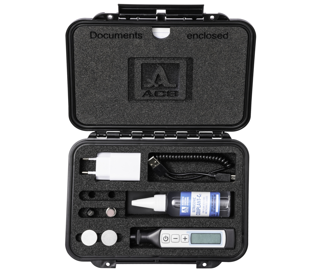 The thickness gauge is enclosed into a one-piece case with a removable tip having a built-in changeable wearproof dual-crystal transducer with an operating frequency of 7 MHz.